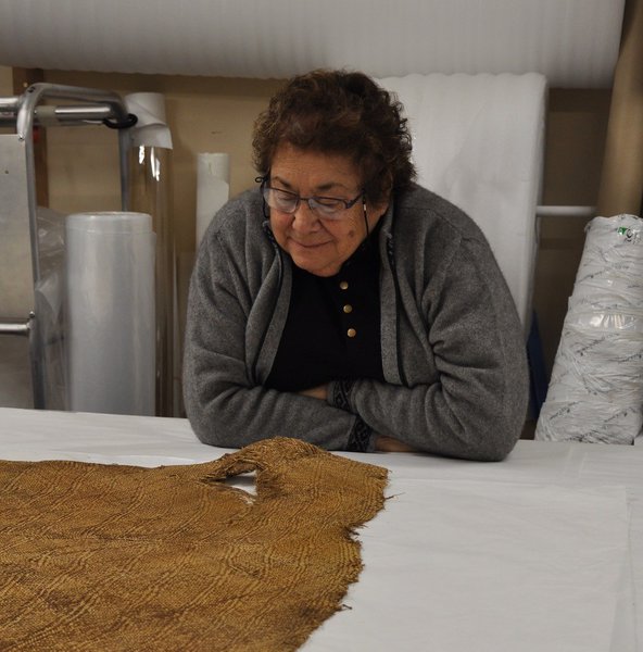 Mrs Ranui Ngarimu examining the kākahu rāranga pūputu at the Museum of Archaeology and Anthropology, Cambridge (D 1924.87). Image taken by Catherine Smith